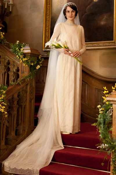 When Mary descends the staircase in her wedding gown, she first asks Carson affectionately if he thinks she will do. He replies "Very nicely milady."
